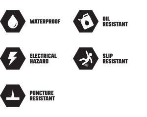 Suelas resistentes: resistentes a resbalones, aceites y abrasión; resistentes al calor hasta 572 °F.